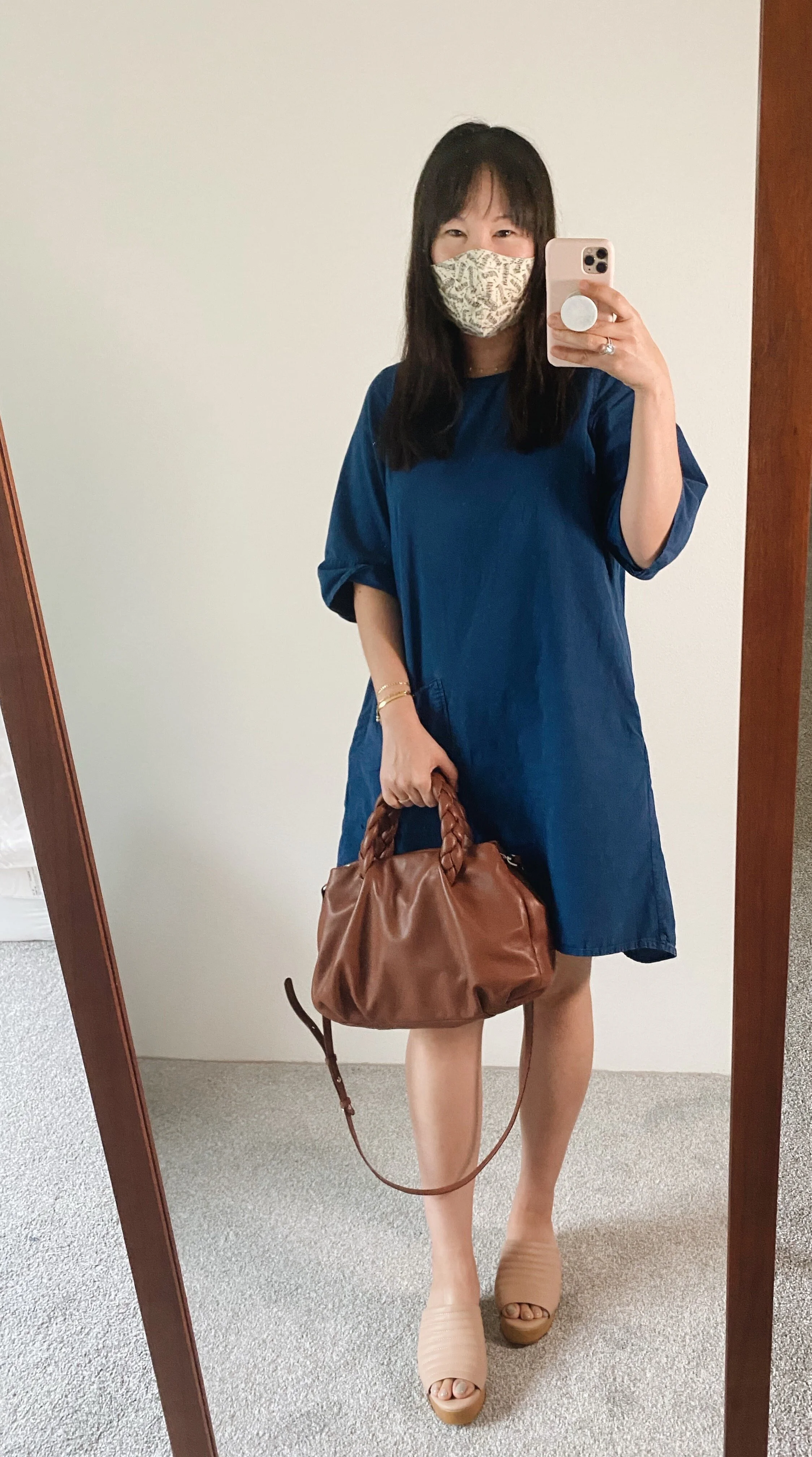 The lambskin leather is wonderfully soft and pillowy, which is perfect for a cloud-like purse like this one. Yet the bag is lightweight overall due to the cotton-lined interior. Inside there’s one inner pocket where I usually stash my card case. The overall design of the bag is great with a strong magnet closure as well as snaps on the side so that you can open the bag wider if you need to (but otherwise you can keep the snaps closed so the opening is smaller). The handles are a nice pillowy braided leather and easy to carry. One reader did say she would be concerned about dirt and grim getting into the braided handles but I’m not too worried (maybe if the bag was a lighter color I would be more careful). And last but not least, there’s an adjustable shoulder strap so this bag can be carried crossbody (a must for me).